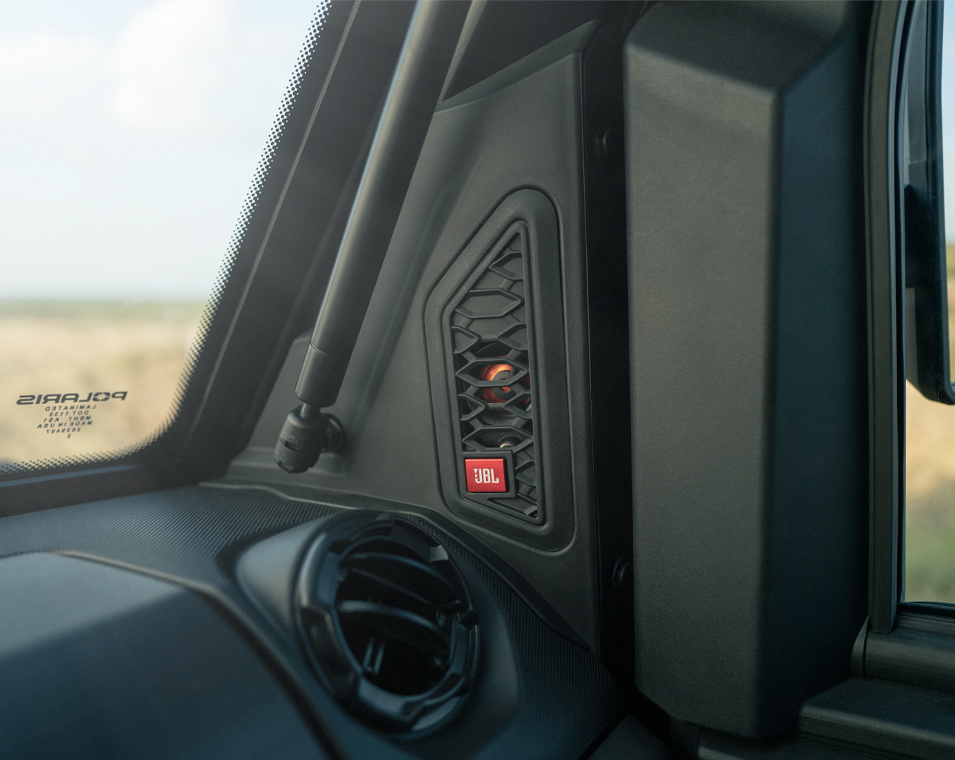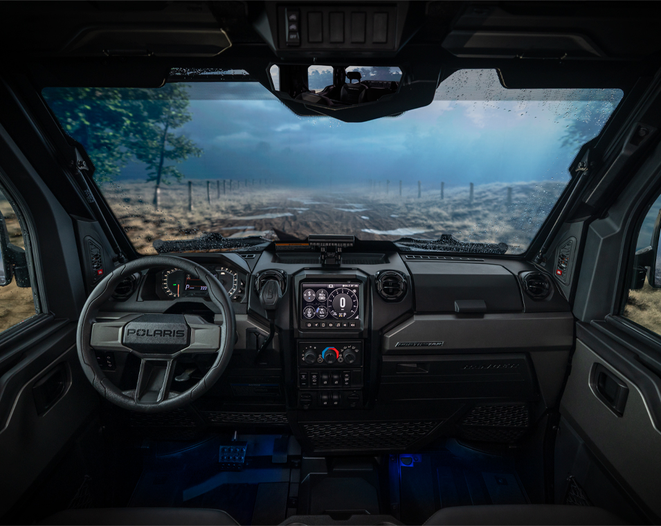 - Factory-installed cab system with powered doors, roof, tip-out glass windshield, glass rear panel, rearview mirror, windshield wiper/washer, and sound insulation materials, Factory-installed heat, AC, defrost, recirculation with 5 different airflow settings, Speed limiting controlled in RIDE COMMAND, 140-amp charging system, Polaris PULSE electrical system (3-position hood and 3-position roof), USB charger, trickle charger, 12-volt accessory outlet, battery trickle-charging port, Pro Series LB Winch with synthetic rope, Auto Stop, wireless remote and Rapid Rope Recovery, Large steel bumper, full-coverage skid plate, bumper D-rings, and top bar.