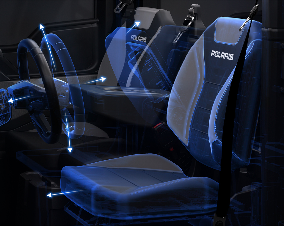 - 3-person, superior contoured and bolstered bench seat with 3-point harness, adjustable driver seat, and flip-down arm rest.
