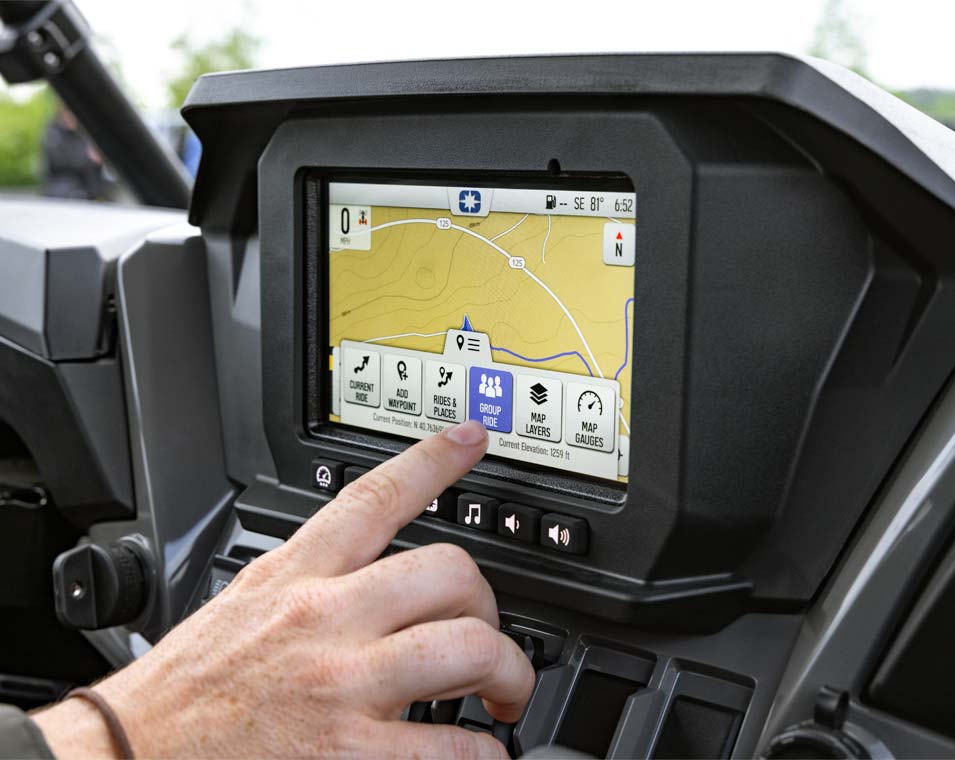 - 7” Display Powered by RIDE COMMAND: Rear View Camera, Digital Instrumentation, Built-In GPS, Group ride (cell-based or GPS based), Topographic Mapping, Bluetooth & USB Smartphone Connectivity, AM/FM & Weather Radio, In-Vehicle Communications Capable With Optional Sena Headsets Speedometer, Odometer, Tripmeter, Tachometer, Coolant Temperature, Volt Meter, Hour Meter, Service Indicator, Clock, Gear Indicator, Fuel Gauge, Hi-Temp Light, Seatbelt Reminder Light, Fault Code Display, DC Outlet, Ambient Temp